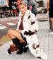 Cowgirl energy meets city cool. This cow-print faux fur coat brings major drama with a luxe longline fit and soft texture—made to turn every crosswalk into a runway moment.