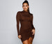 Get drawn to this fab dress that creates a head-turning moment. The dress features a mock neck. long sleeves. a ruched drawstring. and a mini-length silhouette. The dress is composed of a smooth knit fabric that offers a form-hugging fit with a moderate stretch. Complete look with mules and dainty rings.