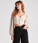 Get drawn in with this pretty corset that stuns! The corset features a sweetheart neckline. padded cups. flexible boning. tank-like shoulder straps. long sleeves with cold-shoulder cutouts. hook and eye front closures. and a cropped hem. The corset is composed of a ponte-like fabric that offers a form-hugging fit with a moderate stretch. Complete look with high waist jeans.
