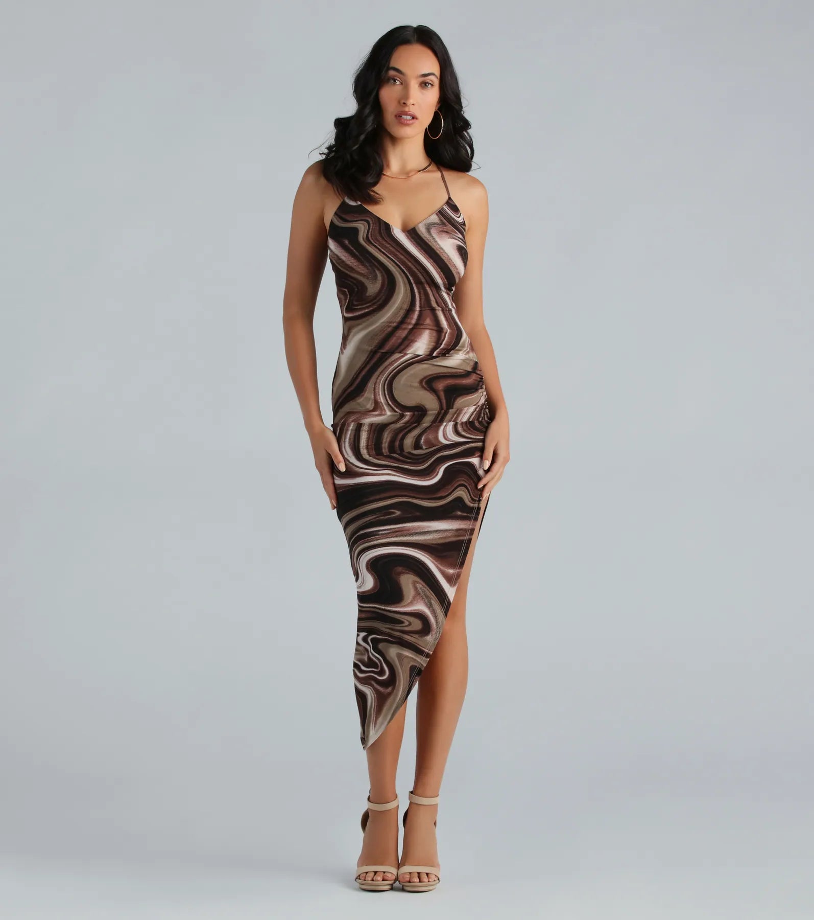 Finished with a gorgeous marble print. this midi dress will be the star of the night! The knee-length dress features a sleeveless V-neckline. adjustable spaghetti straps. a crisscross back. and a bodycon silhouette and side ruched seam that flatters your curves. while the asymmetrical midi-length hem and high side slit show off your legs. Style the midi dress with basic stiletto heels for a sunset dinner.