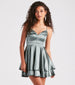 Create a dreamy allure in this satin skater dress for your upcoming social occasions! It features a sleeveless v-neckline. adjustable spaghetti straps. a lace-up back design with zipper closures. and a tiered ruffled short-length hem. Complete the look with a beaded clutch and heels.