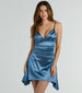A dreamy night awaits in this V-neck satin short dress for going out! The pleated bust and side pleated seam create a flattering fit and flare silhouette. while spaghetti straps and padded bra cups support. The uneven hem adds a playful twist to this dreamy dress! Complete the look in platform heels.