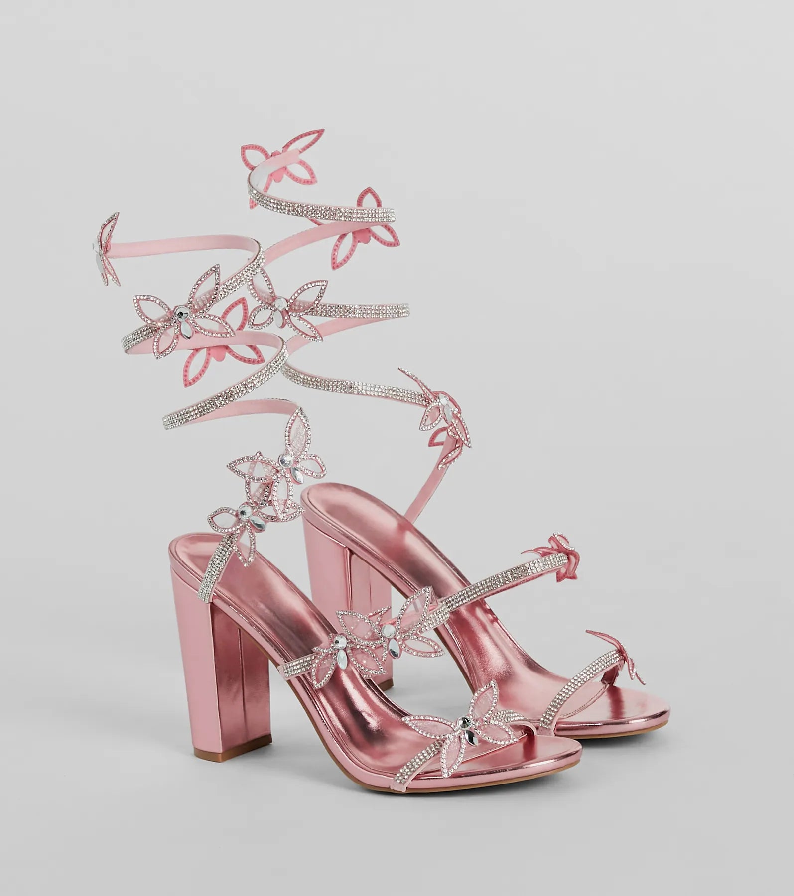 These stunning rhinestone butterfly spiral metallic heels will create the dreamiest formal look so you feel like a true queen! Designed with a fabulous metallic sheen on the faux leather material. these heels feature an open almond-shaped toe. dual straps across the foot. and a glam spiral strap design that wraps around the leg for that trendsetting vibe. The straps are accented with mini rhinestones and glam butterfly appliques with sheer mesh detailing and rhinestones for that gorgeous sparkle. Style these heels with a glitter clutch for an enchanting look!