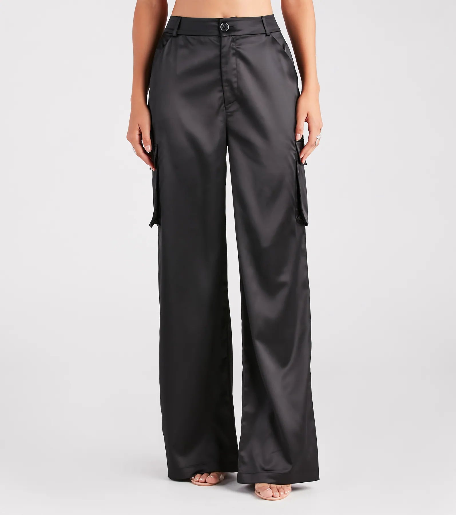 Dress yourself up in these satin cargo pants to elevate your everyday style! They feature a flattering high-rise waist. hidden side pockets. a straight-leg silhouette. and lower cargo flap pockets. and are crafted from silky satin fabric. Complete the look in a basic short sleeve top.