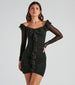 Chic and stunning. this curve-hugging mesh mini dress is perfect for getting drinks with the girls! It features an off-the-shoulder neckline. long sheer fitted sleeves. a ruffle overlay with a ruffled accent down the center. front ruching. and a short. bodycon silhouette. Style with your fave pair of strappy stilettos.