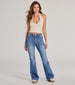A pair of denim jeans feature a flattering mid-rise waist. a hip-hugging fit. and a flared hem for a throwback look. Perfect for everyday styling.