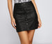 Channel an edgy-chic look with a fab mini skirt! The skirt features a high-rise waist. a multi-button down front. faux front pockets. and a mini-length silhouette. The skirt is composed of a faux leather fabric that offers a form hugging fit. Complete look with a crop top and combat boots.Â