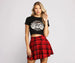 Get an edgy-chic vibe you can take from day to night in this must-have graphic tee! The crop top features slashed detailing with a center motorcycle graphic with angel wings and the script. "American Motorcycles. Custom. Vintage. Special." Pair this tee with a plaid skirt for a girly rocker look.