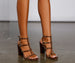 Channel an edgy-chic look with heels that elevate your look! The heels feature an open back. a multi-strap caged design. pyramid-shaped studs. an open almond toe. and a block heel. The heels are composed of a faux leather material. Complete look with a romper and crossbody.