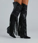 Give off edgy country babe vibes in these sleek fringe western boots! They feature a knee-high height with pull tabs on each side for easy wear. a back zipper closure. small studded-embellished trims. a flowy fringe all-around design. a pointed toe. and a low block heel. The western-style boots are composed of a faux leather material. Pair with a corset top and a mini skirt for a cute bar look!