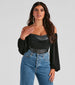 Bring that edgy luxe with a corset top that is part glam. part grunge. The corset features an off-the-shoulder neckline. a sweetheart bust with no-slip strip. padded cups. long chiffon sleeves. corset seams. a draped overlay on the bodice. and a cropped hem. The top is composed of a lined faux leather fabric that offers a form-hugging fit with a moderate stretch. Complete the look with high waist jeans and combat boots.