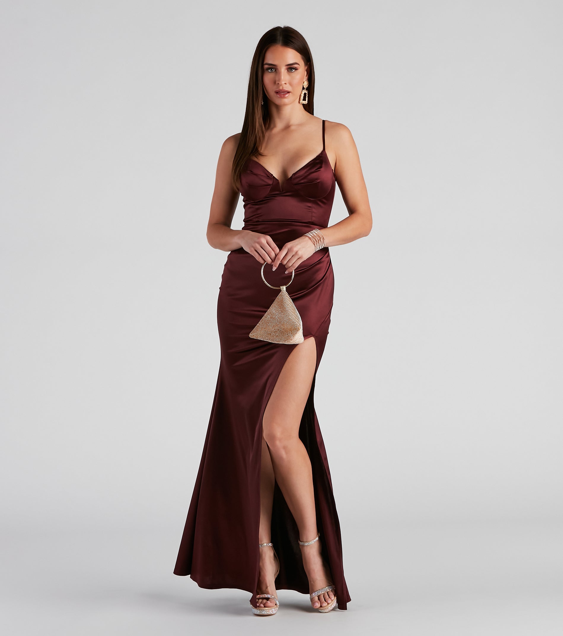 All the allure for your black-tie affair! The Edith formal dress highlights your figure on a luxe satin designed in a sleeveless. sweetheart neck with a v-notch wire inset. and customizable spaghetti straps so you can get the perfect fit. Her high waist seam features side pleating with a sultry side slit for a show of leg on the mermaid floor-length hem. Complete the look with a glam clutch and fringe rhinestone earrings.