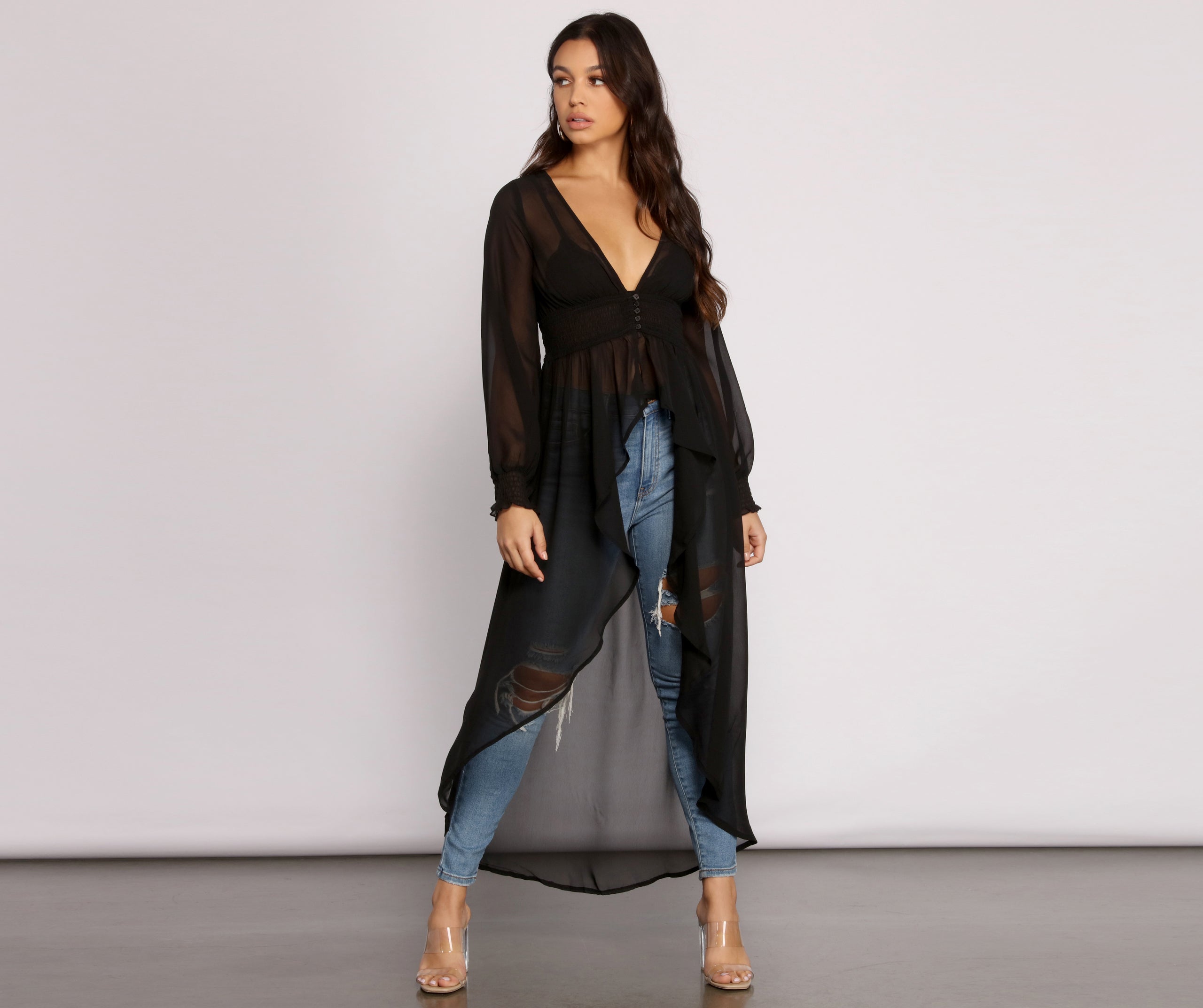 Showcase your effortless beauty in this gorgeous chiffon top! It features a flowy high-low hem with long puff sleeves with smocked cuffs and a stretchy smocked waist with a button-front detail. Wear this top on its own with denim or layer it over a basic bodysuit for a chic look.