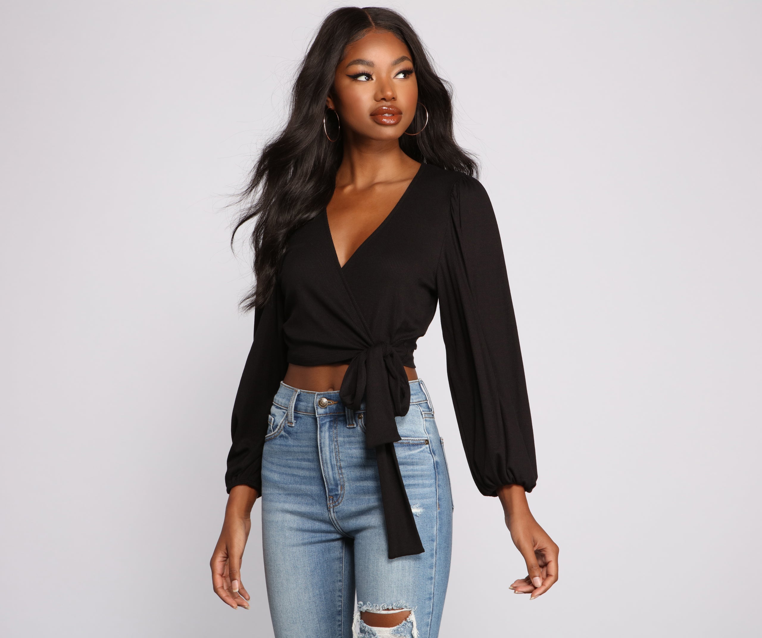 Showcase your effortlessly chic style in this adorable crop top! It features long bishop sleeves with a wrap tie front detail. Pair this top with high waist jeans for a casual brunch date look.