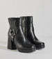 A pair of moto faux leather booties featuring a sleek square toe. a platform sole to elevate the style. a block heel. and a trendy side hoop strap design. Perfect for styling with a jacket.