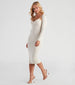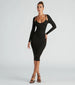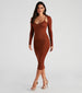 Effortlessly chic for every day. this ribbed knit midi dress is a must-have for fall. It features a V-neckline. a combination of front spaghetti straps and long fitted sleeves. and a midi-length. curve-hugging silhouette. Style with ankle booties for coffee dates this season.