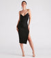 Effortless and romantic. this sleeveless midi dress is a staple to have for every occasion! It features a V-neckline with a twisted bust. spaghetti straps. a form-hugging silhouette. and a sultry front slit. The mid-length dress is stretchy and double-lined. Complete the look in rhinestone mules.