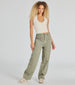 Effortlessly casual. these twill cargo pants feature a high-rise waist. panel pocket detailing. trendy contrast stitching. and a relaxed wide-leg silhouette. Perfect for styling with a graphic tee for every day.