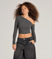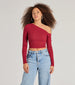 Create effortless outfits with this rib knit crop top flaunting a chic one-shoulder neckline and fitted long sleeves. Complete the look with high-rise jeans.