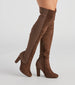 These fitted over-the-knee boots are so effortlessly chic. They feature an almond-shaped toe. a block heel. and an inner zipper closure. The boots are composed of a half faux suede and half stretchy knit composition. Style with a sweater dress and a trendy boater hat.