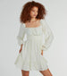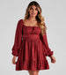 You'll look effortlessly stylish this season in this lightweight and flowy linen dress! Designed with a breezy woven fabric. this short dress is perfect for your summer parties. The bodice is shaped with a square neckline with ruching at the bust and long balloon sleeves. The fitted waistband creates a cinched silhouette. flowing out to a short ruffled hem with an A-line fit for a pretty flair. Complete the look with clear heels.