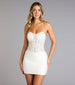 Flirty yet refined. the Elara strapless mini dress stuns with a lace corset bodice and ruched skirt that contours every curve. Sparkling embellishments add the perfect touch of glam for nights that call for unforgettable style.
