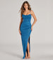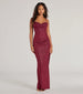 A sleeveless glitter formal dress boasts a flattering cowl sweetheart neckline. lace-up meant to turn heads. and a high front slit for stylish movement. Complete the look with earrings for the school dance.