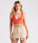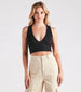 Elevate every outfit with this basic tank top perfect for dressing up. down. or layering! It features a sleeveless V-neckline. wide shoulder straps. and a fitted crop hem on stretchy rib knit fabric. Complete the look in a trendy mini skirt and earrings.