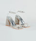 Elevate your look for a special occasion in these stunning heels featuring a sleek square toe. dual rhinestone toe straps. a metallic footbed. a triangular-shaped block heel embellished with rhinestones. and a rhinestone ankle strap with buckle closure. Complete the look with statement earrings.