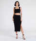 Enter your elevated era with this chic staple ribbed knit midi skirt perf for everyday styling. Designed with a high-cut side slit and bodycon fit. pair with the matching cropped tank for a seamless look.