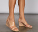 Elevate your style game with wedges that are totally fab and chic! The wedges feature an open back. a clear PVC strap. an open almond toe with a strap over the toe. and a faux leather wedge heel. Complete look with a ruffled midi dress and a shoulder bag.