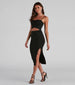 This elevated brushed knit midi dress will be your new go-to for a casual night out. It features a sleeveless square neckline. spaghetti straps. an alluring center cutout at the waist. a midi-length. curve-hugging fit. and a thigh-high side slit. Style with strappy stilettos.