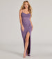 A sleeveless glitter formal dress features a sultry cowl neckline and sheer bodice with flexible boning to give you a snatched look along the slim fit silhouette. Perfect for the school dance or a banquet.