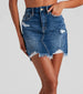 The Elise destructed denim skirt will elevate all of your casual 'fits. The cute mini skirt by Windsor Denim features a high-rise waist. subtle distressing. a short. form-hugging fit. and a trendy frayed hem. The dark wash denim fabric offers a moderate stretch. Style with a crop top and mules.