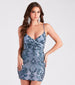 Create a picture-perfect fairytale look in the stunning Ella sequin bodycon dress! She features a sleeveless V-neckline with a wrap-front design. adjustable spaghetti straps for a customized fit. and a short. form-hugging silhouette. The sheer mesh fabric includes a full knit lining and all-over blue sequins with a pretty iridescent hue embroidered in a vintage-inspired scroll pattern. Style this dress with clear heels.