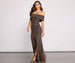 Bring the glow in our Elle dress that shimmers under the spotlight for your next evening out. She features an off the shoulder neckline with a fold-over accent at the bodice. a shimmering glitter fabric throughout and a wrap silhouette with a high side slit. Complete your formal outfit with a dainty bracelet and strappy block heels.