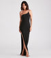 You'll be absolutely captivated in the Ellen formal long dress sure to make jaws drop at banquets. black-tie weddings. and cocktail receptions! She features a sleeveless one-shoulder neckline. a glam rhinestone chainlink strap trim. a slim curve-hugging silhouette. and a sultry high-side slit that leads to her floor-length hem. The formal maxi dress is composed of a smooth and sleek knit fabric with a moderate stretch. Complete the look and style the long dress with a sparkly box clutch and earrings.