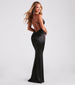 Effortlessly chic. the Elodie satin backless mermaid dress will bring that wow factor to your look. She features a sleeveless V-neckline. spaghetti straps. an alluring open back with a cross-back strap design. a ruched knot accent at the lower back. and a floor-length. slim-fit. mermaid silhouette. The sleek satin fabric has an all-over luxe sheen. Style with rhinestone fringe earrings for your next fancy gala.