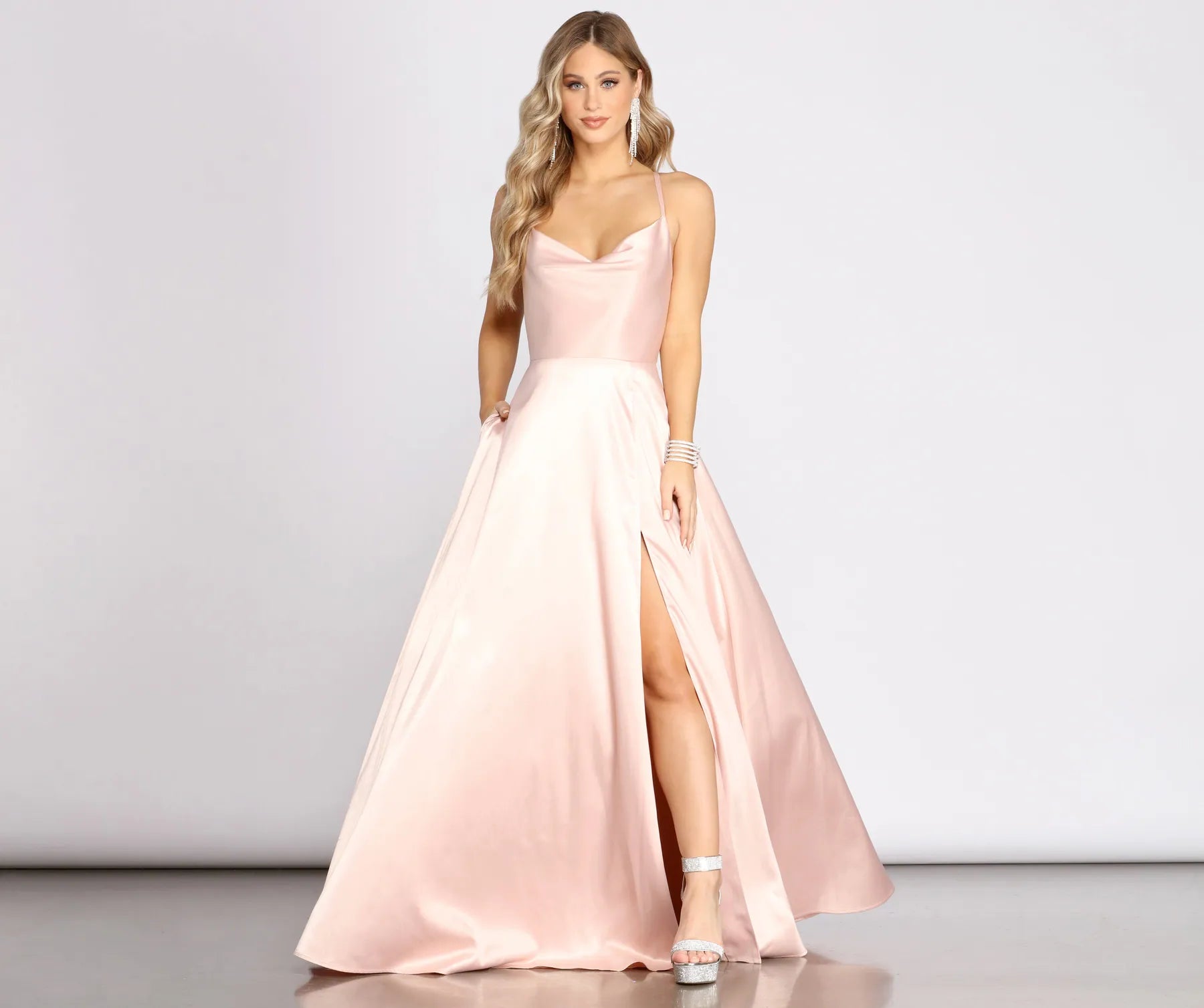 Make your night one to remember in our sleek and chic Eloise! A trendy cowl neck drapes along the front. trailing right into a floor-length skirt and revealing a flirty slit. You'll be happy to find out that she features hidden hand pockets. perfect for storing your essentials.