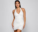 Bring the sparkle to your evening with a formal dress that shimmers under the spotlight! Eloise features a sleeveless. halter v- neckline. sequin geometric pattern. a bodycon silhouette. and a mini-length hem. The dress is composed of a lined mesh fabric with a moderate stretch. Complete look with chrome heels and a rhinestone anklet.Â