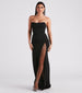 Create a red-carpet worthy look in the glam Emerson formal long dress! She features a strapless neckline with a slightly angled design. a fitted bodice with stylish ruching. a floor-length hem with an A-line silhouette. and a sultry. thigh-high front slit with a sheer mesh insert with sparkling rhinestone embellishments that will catch the light beautifully. Complete the look with rhinestone fringe earrings for your next fancy soiree.