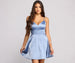 Twirl the night away in the flirty Emme satin party dress! She features a sleeveless V-neckline. adjustable spaghetti straps for a customized fit. a high waist. cute side pockets. and a short skater skirt with a fit and flare silhouette. Complete your look with rhinestone statement earrings and strappy heels.
