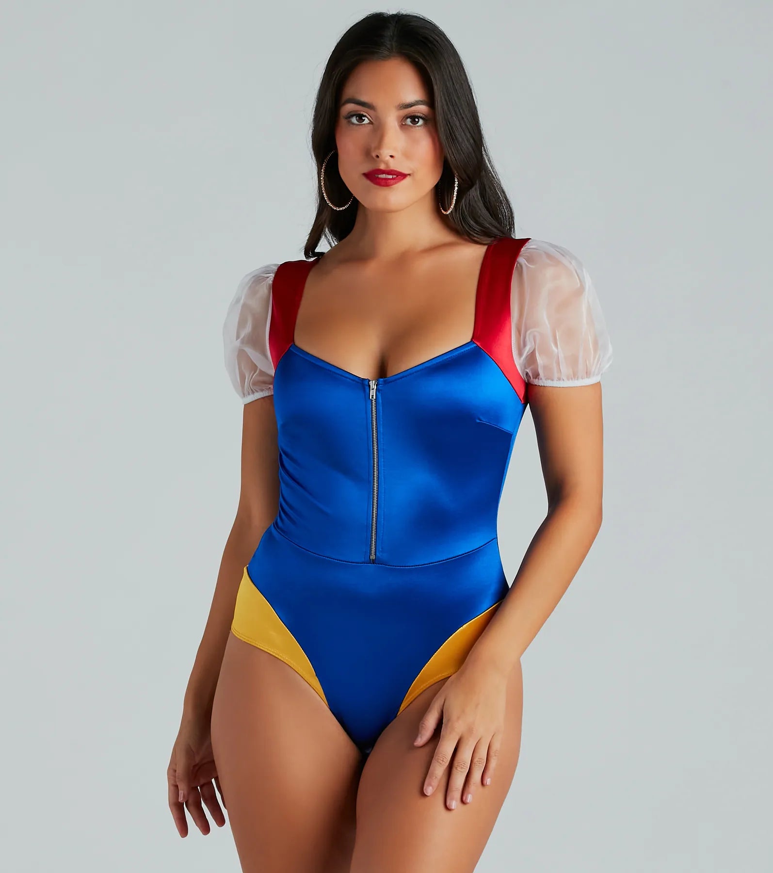 Showcase your ethereal beauty and stay away from those bad apples as an enchanted princess this Halloween! This sleek bodysuit features a subtle sweetheart neckline. a partial zip-front design. sheer full short puff sleeves. a high waist seam. a cheeky bottom. and a form-hugging fit. The satin-knit fabric features an iconic color block pattern. Complete your costume with over-the-knee socks. platform heels. and the rhinestone apple-shaped clutch!