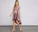 Showcase your enchanting beauty in this stunning high-low dress! It features a fitted lace top with an off-the-shoulder neckline. sheer short sleeves. a small front waist cutout. and a satin high waist skirt with a flowy. high-low. mid-length silhouette. Complete the look with rhinestone earrings and new heels.