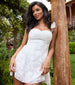 Impress in a flared skater dress with a gorgeous embroidered butterfly lace design throughout. a lace-up back design for a customized fit. ruffled straps. and a classic sweetheart neckline. Complete look with a sleek rhinestone clutch.