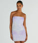You'll be a gorgeous enchanting muse in this glam iridescent sequin mini dress! It features a strapless straight-across neckline with flexible boning inserts at the bodice to provide structure. ruching down the side seams. a mini-length hem. and a bodycon silhouette to flaunt your figure. The lined mesh fabric features all-over iridescent sequin embroidery to give off a stunning ombre effect. Complete your party look with platform heels!