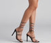 Wrap yourself with a glam vibe in heels that bring style to your party. babe! The heels feature an open back. a rhinestone embellished spiral strap. an open almond toe. and a sleek stiletto heel. The heels are composed of a faux nubuck material. Complete look with a bustier and mini skirt.