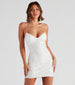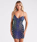 Sassy with plenty of sparkles. the Erica mini dress is sequined to perfection for school dances or a dressy birthday! She features a sleeveless v-neckline. sleek bungee spaghetti straps that cross in the back. a lightly padded bust. and a form-hugging silhouette. The formal dress is composed of a sequin embroidered mesh fabric with a knit lining and minimal stretch. Complete the dressy look with a silver clutch and heels.
