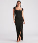 Classic and chic with a hint of sultriness. the Esme formal dress will catch all the glances! She features a square neckline. a fitted corset-designed bodice with flexible boning to provide structure. short cap sleeves. a high waist seam. an asymmetric floor-length hem creating a thigh-high side slit. and a slim-fit silhouette. The crepe fabric offers a moderate stretch. Complete the look with rhinestone statement earrings.