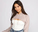 Add a chic touch to your fit' with this cute hoodie topper! The topper features a drawstring hoodie. long sleeves. and a cropped hem. The hoodie topper is composed of a knit fabric that offers a relaxed fit. Complete look with a ribbed mini dress.Â